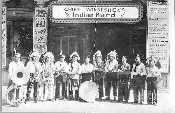 Former Carlisle student. Founder of Chief Winneshiek’s Indian Band. He is touring the country with a sixteen-piece band. There are three ex-Carlisle students in the band. Have been working steadily and plan to return and play at Carlisle. The reverse of the letter has a flyer that advertises the all-Indian band along with several others as part of an advertisement for Conn Band Instruments."